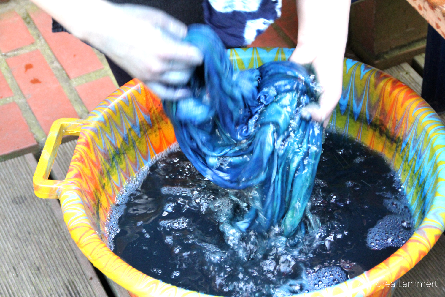 Verbunden mit der Faser ist die Farbe nun wieder wasserunlöslich. Fahren Sie fort um zu lernen wie man mit Indigopflanzen färbt.